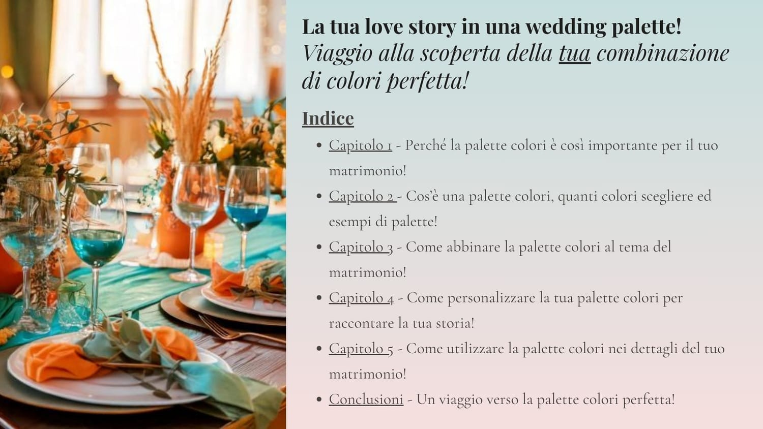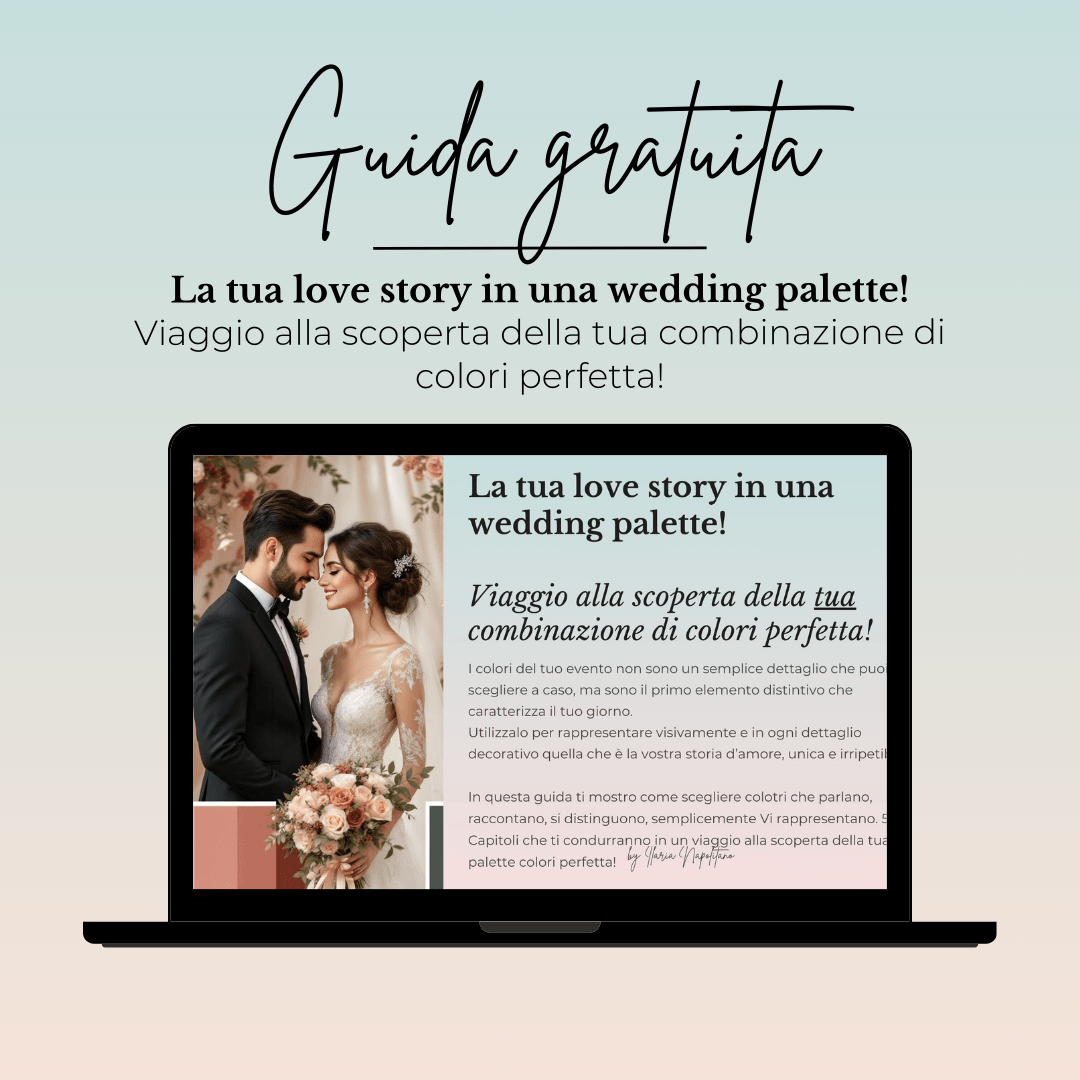 ✅ Minuto 1: Ricevi la guida completa via email ✅ Giorno 1: Leggi i primi capitoli e compili il worksheet ✅ Giorno 2: Hai già una bozza della tua palette unica ✅ Settimana 1: Hai la palette definitiva che racconta la vostra storia ✅ Giorno del matrimonio: Un evento che è davvero vostro