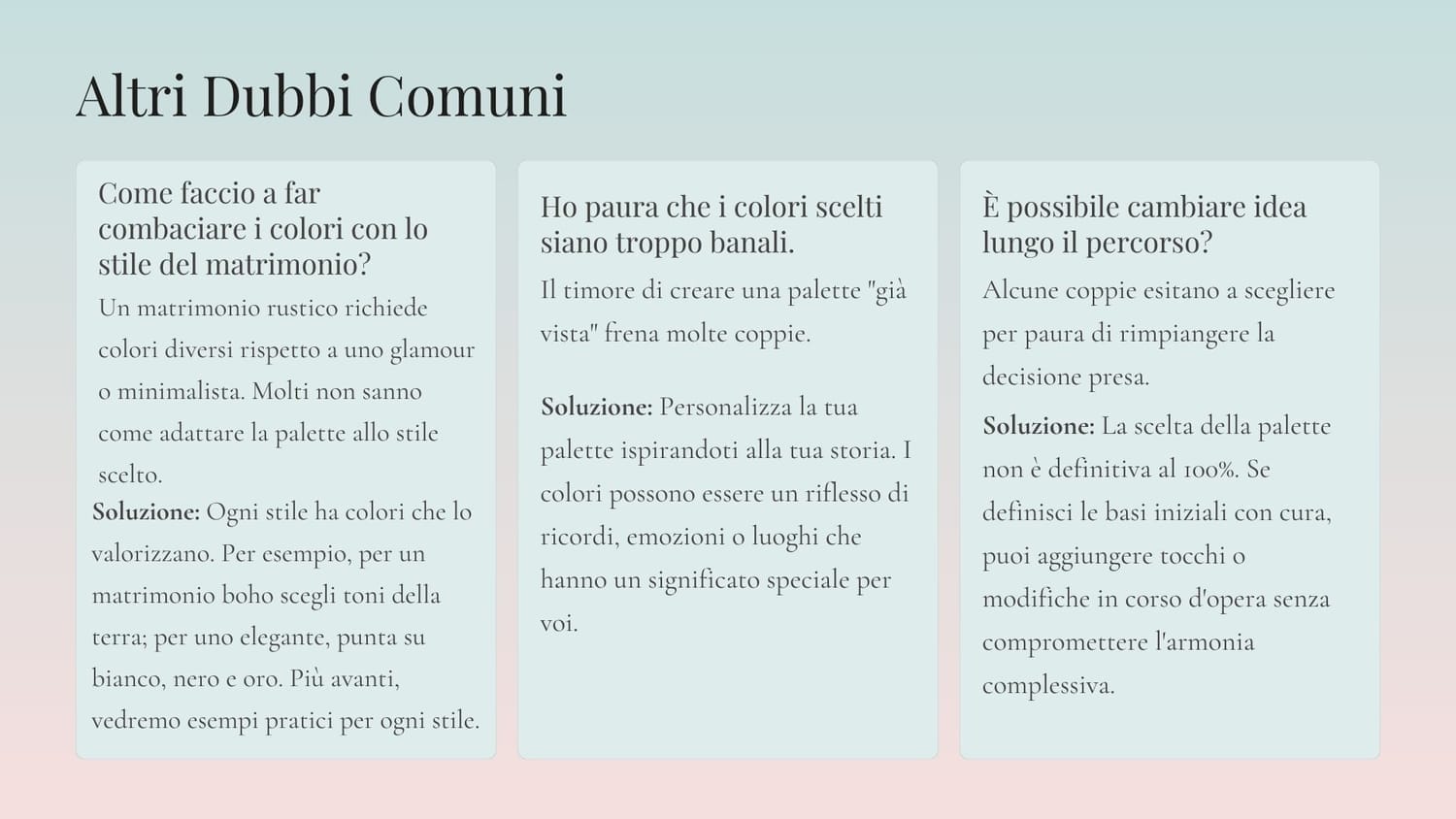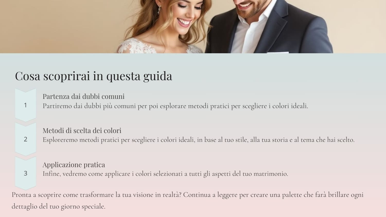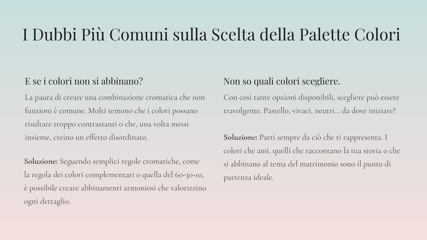 Ho creato questa guida perché vedo troppe spose bellissime che si accontentano di palette "carine" invece di cercare colori che nascono dal loro cuore.